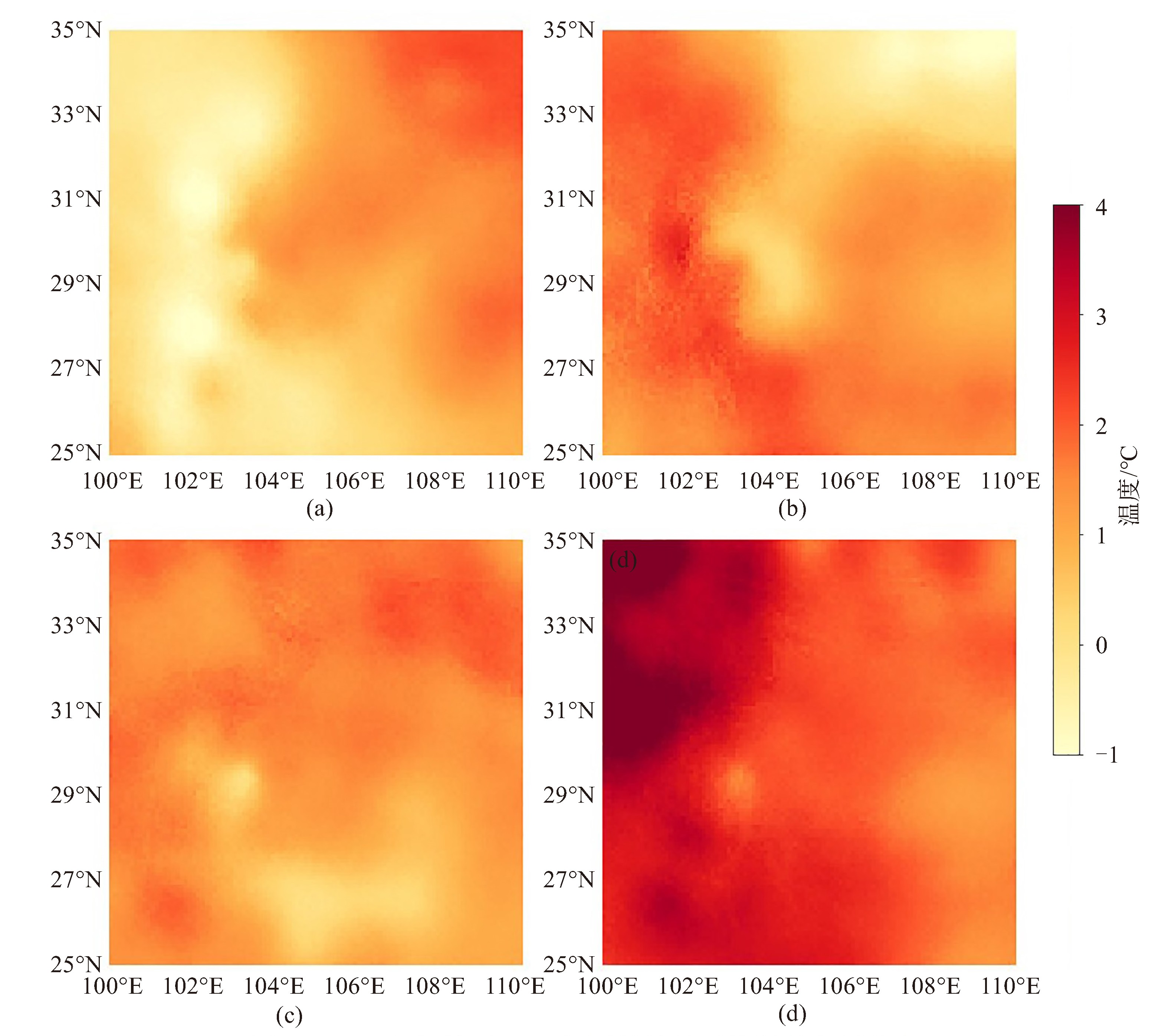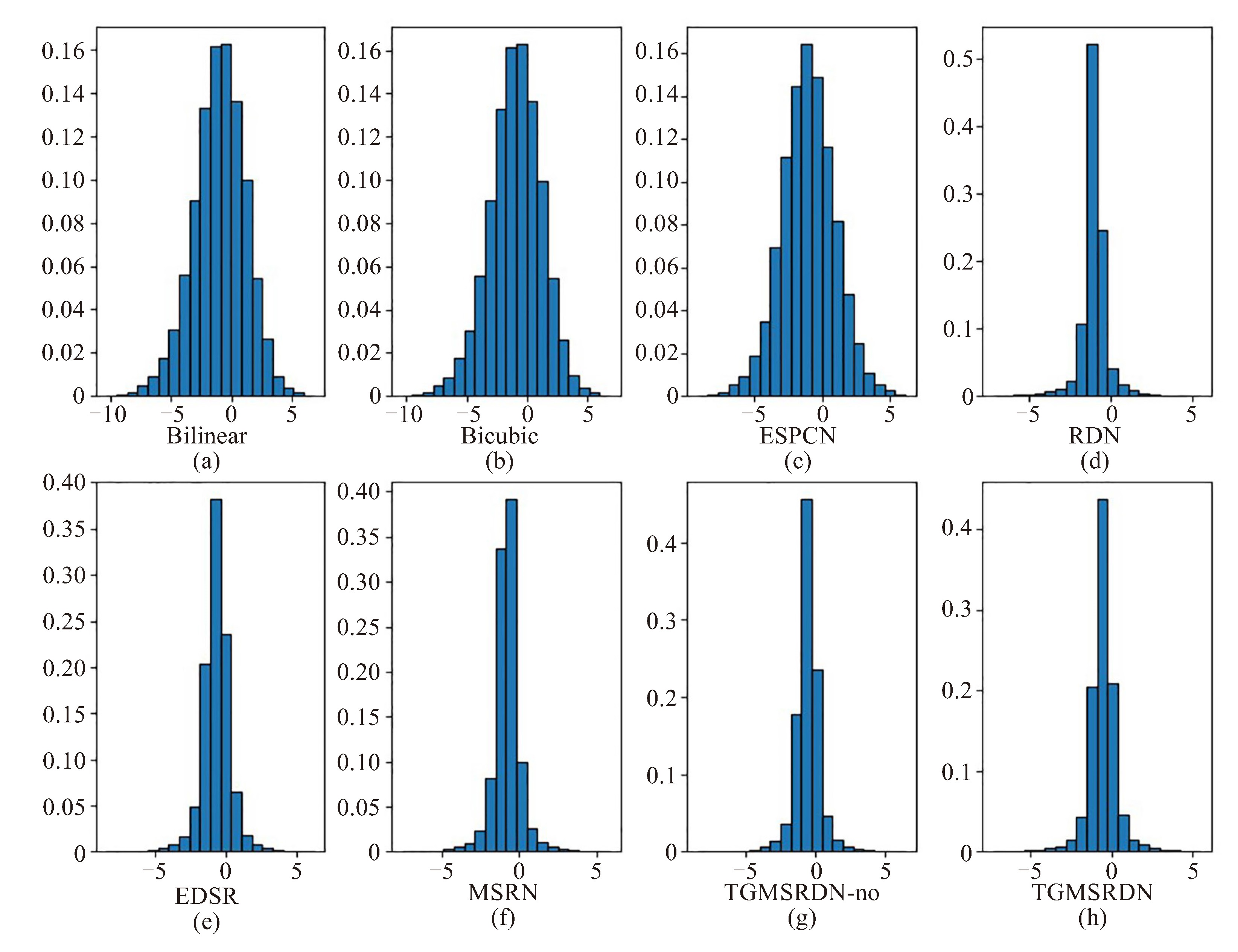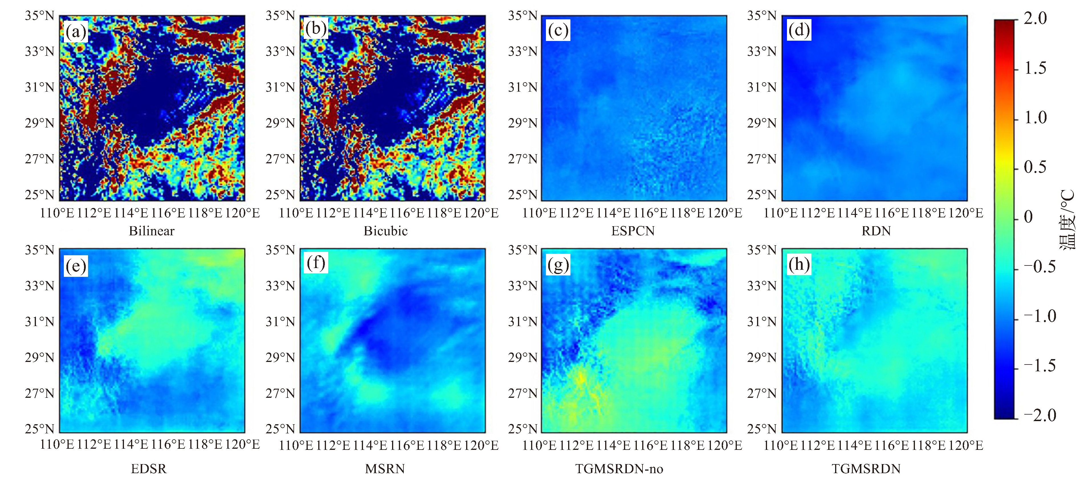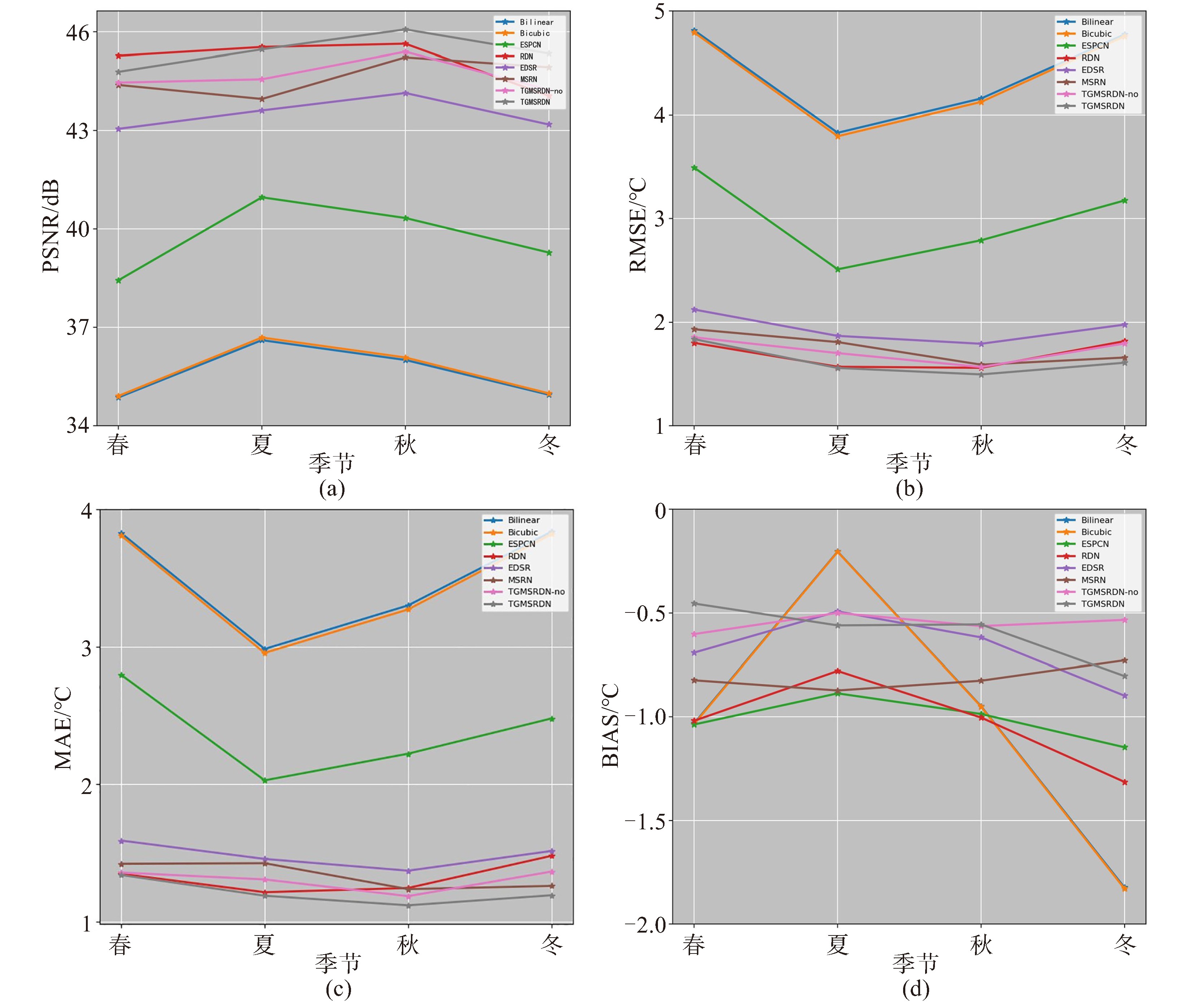 方法 平均 PSNR RMSE MSE MAE BIAS SSIM Bilinear 35.60 4.41 19.46 3.48 -0.99 0.05 Bicubic 35.66 4.38 19.23 3.46 -1.00 0.06 ESPCN 39.75 3.01 9.08 2.38 -1.01 0.792 RDN 45.13 1.68 2.85 1.32 -1.02 0.891 MSRN 44.62 1.75 3.07 1.33 -0.81 0.897 EDSR 43.49 1.94 3.77 1.48 -0.67 0.869 TGMSRDN-no 44.66 1.73 2.99 1.30 -0.59 0.882 TGMSRDN 45.41 1.62 2.65 1.21 -0.55 0.903 表 3 各方法季节尺度评价指标结果(粗体表示最佳,数值为“春/夏/秋/冬”)