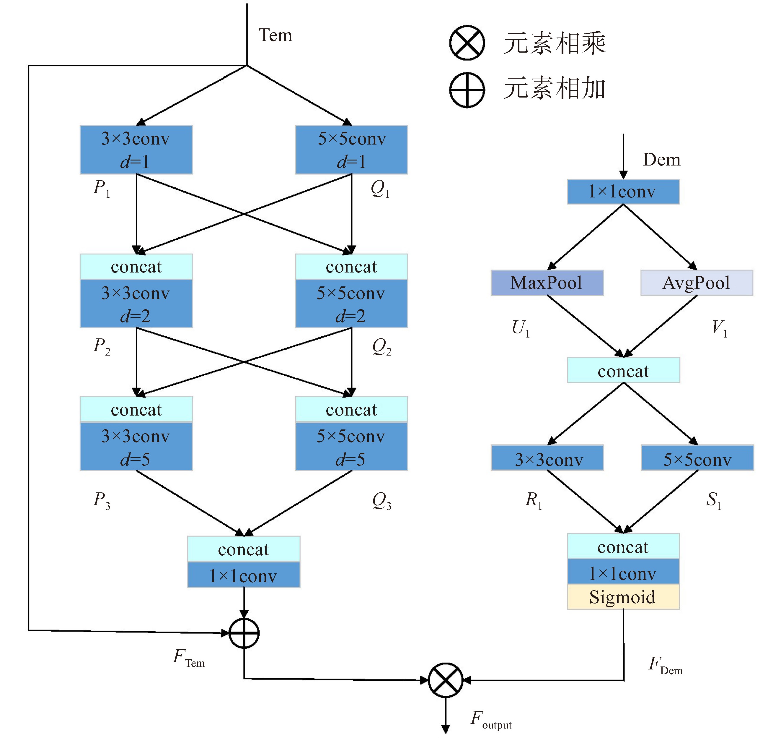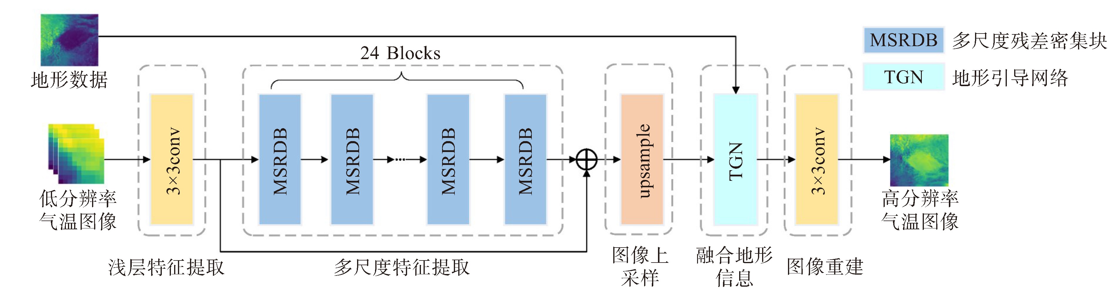 摘要: CMIP6全球气候模式是预测未来气候变化的重要工具之一,然而其输出数据的空间分辨率较为粗糙(通常大于1 °),难以直接应用于区域尺度气候变化研究。为此,本文提出一种地形引导的多尺度残差密集网络(Terrain-Guided Multi-Scale Residual Dense Network,TGMSRDN)降尺度模型,旨在提高应用于中国西南地区全球气候模式日平均气温数据的空间分辨率和精度。具体而言,该模型构建一种多尺度残差密集块,用于从粗分辨率气温数据中提取多尺度特征信息。此外,为充分利用地形信息,本文提出一种地形引导网络,该网络采用注意力机制有效聚合气温数据与地形信息,从而更精细地恢复了气温数据的空间细节。在中国西南地区进行的对比实验表明,TGMSRDN能够有效地将全球气候模式日平均气温空间分辨率由1 °提升到0.1 °,效果优于其它对比方法。最后,本文应用所提模型对研究区域2015—2050年在四种预估情景下(SSP1-2.6、SSP2-4.5、SSP3-7.0、SSP5-8.5)气温预估数据进行降尺度分析。结果显示,四种情景下研究区域年平均气温均呈上升趋势,特别是在SSP5-8.5情景下,至2050年研究区域的升温幅度将超过1.5 ℃。
